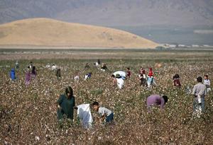 (250913) -- DUSAMBE, 13 septiembre, 2025 (Xinhua) -- Imagen del 12 de septiembre de 2025 de personas recolectando algodón en un campo, cerca de Dangara, en la región de Khatlon, Tayikistán. (Xinhua/Li Renzi) (jg) (da)