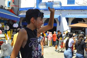 (250807) -- TUNEZ, 7 agosto, 2025 (Xinhua) -- Imagen del 6 de agosto de 2025 de un joven refrescándose con agua, en el centro de Túnez, Túnez. Túnez ha sufrido olas de calor en los últimos días. (Xinhua/Adel Ezzine) (da) (ra) (vf)