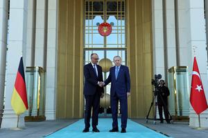 (251030) -- ANKARA, 30 octubre, 2025 (Xinhua) -- El presidente turco, Recep Tayyip Erdogan (d), estrecha la mano del visitante canciller alemán, Friedrich Merz, en Ankara, Turquía, el 30 de octubre de 2025. (Xinhua/Mustafa Kaya) (rtg) (ra) (ce)