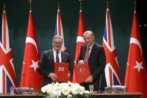 (251027) — ANKARA, 27 octubre, 2025 (Xinhua) — El presidente turco, Recep Tayyip Erdogan (d), y el primer ministro británico, Keir Starmer, muestran el acuerdo firmado, en Ankara, Turquía, el 27 de octubre de 2025. Turquía firmó un acuerdo el lunes para comprar 20 aviones de combate Eurofighter Typhoon de Reino Unido por 8 billones de libras (10,64 billones de dólares estadounidenses), mientras Ankara busca reforzar sus capacidades de defensa en medio de un panorama regional turbulento. (Xinhua/Mustafa Kaya) (rtg) (ah) (ce)