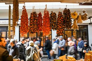 (260413) -- ESTAMBUL, 13 abril, 2026 (Xinhua) -- Imagen del 11 de abril de 2026 de personas caminando frente a una tienda de productos secos, en el distrito Eminonu, en Estambul, Turquía. Las tensiones geopolíticas en Medio Oriente y las interrupciones en el transporte marítimo a través del estrecho de Ormuz han provocado una nueva ronda de aumentos de precios que entraron en vigor a principios de abril. (Xinhua/Liu Lei) (oa) (ah) (vf)