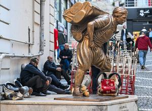 (251201) — ESTAMBUL, 1 diciembre, 2025 (Xinhua) — Imagen del 25 de noviembre de 2025 de porteadores descansando junto a una estatua de un porteador, en el distrito comercial de Eminonu de Estambul, Turquía. En el casco antiguo de Estambul, es frecuente encontrar una escena familiar: hombres serpenteando por calles estrechas, transportando pesadas cargas en sus espaldas o empujándolas en carretas. Conocidos en turco como «hamal», estos porteadores tradicionales representan una profesión que se remonta a la época otomana y perdura hasta nuestros días. (Xinhua/(Liu Lei) (rtg) (ah) (ce)