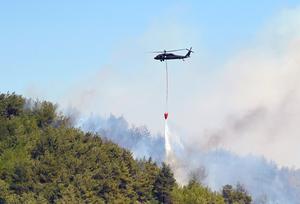 (250630) -- IZMIR, 30 junio, 2025 (Xinhua) -- Un helicóptero apaga un incendio, en el distrito de Seferihisar, en Izmir, Turquía, el 30 de junio de 2025. Turquía ha evacuado a más de 50.000 personas de las regiones afectadas por incendios forestales en todo el país, y la provincia occidental de Izmir representa la mayoría de las evacuaciones, dijo el lunes la agencia de desastres del país. (Xinhua/Mustafa Kaya) (rtg) (oa) (vf)