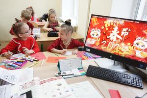 (250128) -- KIEV, 28 enero, 2025 (Xinhua) -- Estudiantes crean tarjetas de felicitación durante un evento cultural con motivo de la próxima Fiesta de la Primavera en el Gimnasio de Lenguas Orientales No. 1 de Kiev, en Kiev, Ucrania, el 28 de enero de 2025. (Xinhua/Roman Petushkov) (oa) (ah) (ce)