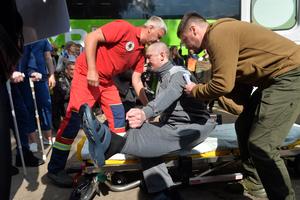 (250613) — KIEV, 13 junio, 2025 (Xinhua) — Imagen del 12 de junio de 2025 de un prisionero de guerra ucraniano liberado siendo trasladado a una camilla antes de ser enviado a un centro de asistencia médica. Ucrania y Rusia llevaron a cabo el jueves la segunda fase de un intercambio de prisioneros gravemente enfermos y severamente heridos, dijeron las autoridades ucranianas. (Xinhua/Peter Druk) (jg) (da) (ce)