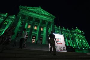 (251024) -- MONTEVIDEO, 24 octubre, 2025 (Xinhua) -- Imagen del 23 de octubre de 2025 de personas caminando frente al Palacio Legislativo durante la 6ª Bienal de Montevideo "Amazonas Ancestral", en Montevideo, capital de Uruguay. (Xinhua/Nicolás Celaya) (nc) (oa) (ra) (ce)
