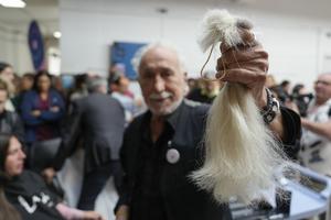 (251020) -- MONTEVIDEO, 20 octubre, 2025 (Xinhua) -- Un peluquero muestra el cabello de una mujer después de cortarlo durante una jornada de donación de cabello a beneficio de la confección de accesorios y pelucas para mujeres en tratamiento oncológico en ocasión del Día Mundial de Lucha contra el Cáncer de Mama, en Montevideo, capital de Uruguay, el 20 de octubre de 2025. (Xinhua/Nicolás Celaya) (nc) (oa) (ah) (ce)