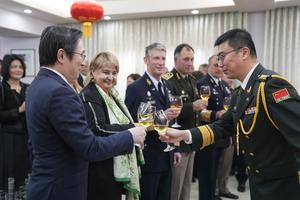 (250802) — MONTEVIDEO, 2 agosto, 2025 (Xinhua) — Imagen del 1 de agosto de 2025 de la ministra de Defensa uruguaya, Sandra Lazo (2-i), brindando con el embajador chino en Uruguay, Huang Yazhong (i), y el agregado de defensa de la Embajada china en Uruguay, Coronel Superior Wang Shuai (d), durante la celebración del 98° aniversario del Ejército Popular de Liberación (EPL) de China, en Montevideo, capital de Uruguay. Autoridades de China y Uruguay expresaron el viernes su compromiso con la paz y la cooperación bilateral en materia de defensa en el marco de la celebración en Montevideo del 98° aniversario del EPL de China. (Xinhua/Nicolás Celaya) (nc) (jg) (da)