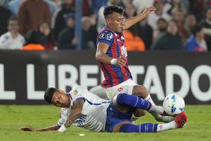 (250410) -- MONTEVIDEO, 10 abril, 2025 (Xinhua) -- Imagen del 9 de abril de 2025 del jugador Julián Millán (abajo), de Nacional de Uruguay, disputando el balón con Luciano Rodríguez (arriba), de Bahía de Brasil, durante el partido del grupo F de la jornada 2 de la Fase de Grupos de la Copa Conmebol Libertadores, celebrado en el estadio Gran Parque Central, en Montevideo, capital de Uruguay. (Xinhua/Nicolás Celaya) (nc) (rtg) (ra) (vf)