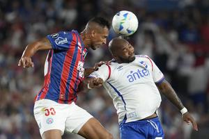 (250410) -- MONTEVIDEO, 10 abril, 2025 (Xinhua) -- Imagen del 9 de abril de 2025 del jugador Diego Herazo (d), de Nacional de Uruguay, disputando el balón con David Duarte (i), de Bahía de Brasil, durante el partido del grupo F de la jornada 2 de la Fase de Grupos de la Copa Conmebol Libertadores, celebrado en el estadio Gran Parque Central, en Montevideo, capital de Uruguay. (Xinhua/Nicolás Celaya) (nc) (rtg) (ra) (vf)