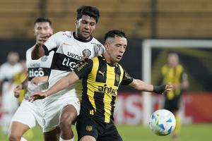 (250515) -- MONTEVIDEO, 15 mayo, 2025 (Xinhua) -- Imagen del 14 de mayo de 2025 del jugador, Leonardo Fernández (d), de Peñarol, de Uruguay, disputando el balón con Robert Rojas (i), de Olimpia, de Paraguay, durante el partido del grupo H de la jornada 5 de la fase de grupos de la Copa Conmebol Libertadores, celebrado en el Estadio Campeón del Siglo, en Montevideo, capital de Uruguay. (Xinhua/Nicolás Celaya) (nc) (rtg) (ra) (ce)