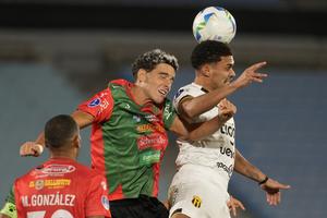 (250402) -- MONTEVIDEO, 2 abril, 2025 (Xinhua) -- Imagen del 1 de abril de 2025 del jugador Federico Dafonte (c), de Boston River de Uruguay, disputando el balón con Gustavo Vargas (d), de Guaraní de Paraguay, durante el partido del grupo A de la jornada 1 de la Fase de Grupos de la Copa Conmebol Sudamericana, celebrado en el Estadio Centenario, en Montevideo, capital de Uruguay. (Xinhua/Nicolás Celaya) (nc) (ah) (ra) (vf)
