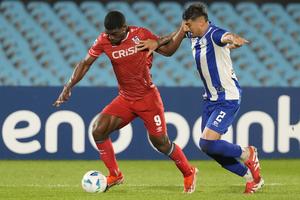 (250508) — MONTEVIDEO, 8 mayo, 2025 (Xinhua) — Imagen del 7 de mayo de 2025 del jugador Facundo Parada (d), de Cerro Largo de Uruguay, disputando el balón con Azarías Londoño (i), de Universidad Católica de Ecuador, durante el partido del grupo B de la jornada 4 de la fase de grupos de la Copa Conmebol Sudamericana, celebrado en el estadio Centenario, en Montevideo, capital de Uruguay. (Xinhua/Nicolás Celaya) (nc) (rtg) (ra) (vf)