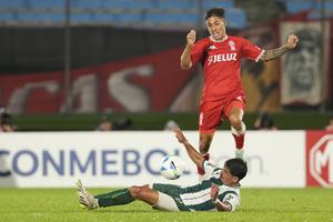 (250509) -- MONTEVIDEO, 9 mayo, 2025 (Xinhua) -- Imagen del 8 de mayo de 2025 del jugador Lucas Rodríguez (abajo), de Racing de Uruguay, disputando el balón con Matías Tissera (arriba), de Huracán de Argentina, durante el partido del grupo C de la jornada 4 de la fase de grupos de la Copa Conmebol Sudamericana, celebrado en el Estadio Centenario, en Montevideo, capital de Uruguay. (Xinhua/Nicolás Celaya) (nc) (rtg) (ra) (vf)