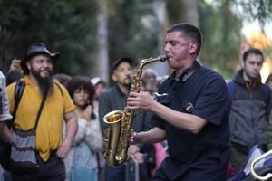 (251002) -- MONTEVIDEO, 2 octubre, 2025 (Xinhua) -- Imagen del 1 de octubre de 2025 de un músico de la banda La Ventolera realizando una presentación callejera en el marco del Día Internacional de la Música organizada por el Instituto Nacional de Música, en la Ciudad Vieja de Montevideo, capital de Uruguay. (Xinhua/Nicolás Celaya) (nc) (rtg) (ra) (vf)