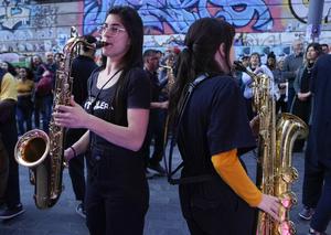 (251002) -- MONTEVIDEO, 2 octubre, 2025 (Xinhua) -- Imagen del 1 de octubre de 2025 de músicos de la banda La Ventolera realizando una presentación callejera en el marco del Día Internacional de la Música organizada por el Instituto Nacional de Música, en la Ciudad Vieja de Montevideo, capital de Uruguay. (Xinhua/Nicolás Celaya) (nc) (rtg) (ra) (vf)