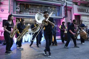 (251002) -- MONTEVIDEO, 2 octubre, 2025 (Xinhua) -- Imagen del 1 de octubre de 2025 de músicos de la banda La Ventolera realizando una presentación callejera en el marco del Día Internacional de la Música organizada por el Instituto Nacional de Música, en la Ciudad Vieja de Montevideo, capital de Uruguay. (Xinhua/Nicolás Celaya) (nc) (rtg) (ra) (vf)