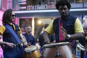 (251002) -- MONTEVIDEO, 2 octubre, 2025 (Xinhua) -- Imagen del 1 de octubre de 2025 de músicos de la banda La Ventolera realizando una presentación callejera en el marco del Día Internacional de la Música organizada por el Instituto Nacional de Música, en la Ciudad Vieja de Montevideo, capital de Uruguay. (Xinhua/Nicolás Celaya) (nc) (rtg) (ra) (vf)