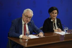 (250819) -- MONTEVIDEO, 19 agosto, 2025 (Xinhua) -- El ministro de Relaciones Exteriores uruguayo, Mario Lubetkin (i), y la ministra de Relaciones Exteriores y Movilidad Humana ecuatoriana, Gabriela Sommerfeld (d), participan en la ceremonia de traspaso a Uruguay de la presidencia temporal del Consenso de Brasilia llevada a cabo en la Torre Ejecutiva, sede del Gobierno uruguayo, en Montevideo, capital de Uruguay, el 19 de agosto de 2025. (Xinhua/Nicolás Celaya) (nc) (jg) (ra) (ce)