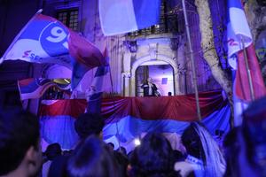 (250512) -- MONTEVIDEO, 12 mayo, 2025 (Xinhua) -- Imagen del 11 de mayo de 2025 del intendente electo de Montevideo, Mario Bergara (c-arriba), hablando después de conocerse los resultados de las elecciones departamentales, en la sede del Frente Amplio, en Montevideo, capital de Uruguay. (Xinhua/Nicolás Celaya) (nc) (rtg) (ah) (ce)