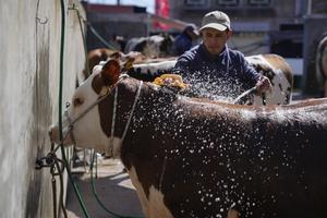 (250909) -- MONTEVIDEO, 9 septiembre, 2025 (Xinhua) -- Un hombre baña a un novillo durante la edición 120 de la Exposición Internacional de Ganadería y Muestra Internacional Agro Industrial y Comercial "Expo Prado", en Montevideo, capital de Uruguay, el 9 de septiembre de 2025. (Xinhua/Nicolás Celaya) (nc) (jg) (ra) (ce)