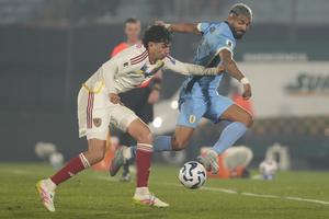 (250611) — MONTEVIDEO, 11 junio, 2025 (Xinhua) — Imagen del 10 de junio de 2025 del jugador Rodrigo Aguirre (d), de Uruguay, disputando el balón con Nahuel Ferraresi (i), de Venezuela, durante el partido correspondiente a las Eliminatorias Sudamericanas para el Mundial de Estados Unidos, México y Canadá 2026, celebrado en el Estadio Centenario, en Montevideo, capital de Uruguay. (Xinhua/Nicolás Celaya) (nc) (ra) (vf)