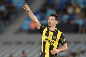 (250202) -- MONTEVIDEO, 2 febrero, 2025 (Xinhua) -- Imagen del 1 de febrero de 2025 del jugador Maximiliano Silvera, de Peñarol, festejando su anotación durante el partido correspondiente a la primera fecha del Torneo Apertura del Campeonato Uruguayo de Fútbol, ante Progreso, celebrado en el estadio Centenario, en Montevideo, capital de Uruguay. (Xinhua/Nicolás Celaya) (nc) (rtg) (da)