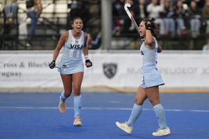 (250804) -- MONTEVIDEO, 4 agosto, 2025 (Xinhua) -- Imagen del 3 de agosto de 2025 de la jugadora Agustina Gorzelany (d), de Argentina, festejando su anotación durante la final femenina de la Copa Panamericana de Hockey sobre Césped, ante Estados Unidos, en Carrasco, en Montevideo, capital de Uruguay. (Xinhua/Nicolás Celaya) (nc) (rtg) (ah) (vf)