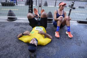 (250504) — MONTEVIDEO, 4 mayo, 2025 (Xinhua) — Corredores descansan después de cruzar la meta durante la décima edición del Maratón de Montevideo, en Montevideo, capital de Uruguay, el 4 de mayo de 2025. (Xinhua/Nicolás Celaya) (nc) (oa) (da)