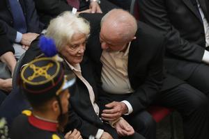 (250515) -- MONTEVIDEO, 15 mayo, 2025 (Xinhua) -- El presidente brasileño, Luiz Inácio Lula da Silva (d), habla con la viuda del expresidente uruguayo, José "Pepe" Mujica, la exvicepresidenta Lucía Topolansky (c), durante la segunda jornada del velatorio de Mujica, en el Palacio Legislativo, la sede del Parlamento, en Montevideo, capital de Uruguay, el 15 de mayo de 2025. Miles de uruguayos continuaban el jueves con su paso frente a la capilla ardiente del expresidente José "Pepe" Mujica, fallecido el pasado 13 de mayo a los 89 años de edad, en la segunda y última jornada del velatorio desarrollado en el Palacio Legislativo, en la ciudad de Montevideo. (Xinhua/Nicolás Celaya) (nc) (jg) (ah) (vf)