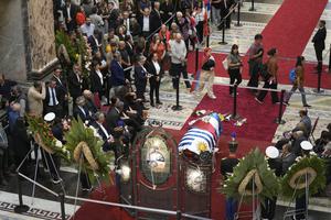 (250514) -- MONTEVIDEO, 14 mayo, 2025 (Xinhua) -- Personas asisten al velatorio del expresidente uruguayo, José "Pepe" Mujica, en el Salón de los Pasos Perdidos del Palacio Legislativo, la sede del Parlamento, en Montevideo, capital de Uruguay, el 14 de mayo de 2025. La capilla ardiente del expresidente de Uruguay, José "Pepe" Mujica (2010-2015), fallecido el martes a los 89 años de edad, quedó abierta al público el miércoles en el Salón de los Pasos Perdidos del Palacio Legislativo, la sede del Parlamento en la ciudad de Montevideo. (Xinhua/Nicolás Celaya) (nc) (ah) (ra) (ce)