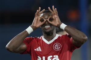 (250516) -- MONTEVIDEO, 16 mayo, 2025 (Xinhua) -- Imagen del 15 de mayo de 2025 del jugador Ricardo Mathías, de Internacional de Brasil, festejando su anotación durante el partido correspondiente al grupo F de la Copa CONMEBOL Libertadores, ante Nacional de Uruguay, celebrado en el estadio Gran Parque Central, en Montevideo, capital de Uruguay. (Xinhua/Nicolás Celaya) (nc) (da) (vf)