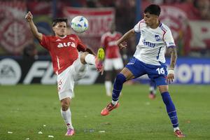 (250516) -- MONTEVIDEO, 16 mayo, 2025 (Xinhua) -- Imagen del 15 de mayo de 2025 del jugador Lucas Villalba (d), de Nacional de Uruguay, disputando el balón con Alexandro Bernabei (i), de Internacional de Brasil, durante el partido correspondiente al grupo F de la Copa CONMEBOL Libertadores, celebrado en el estadio Gran Parque Central, en Montevideo, capital de Uruguay. (Xinhua/Nicolás Celaya) (nc) (oa) (da) (vf)