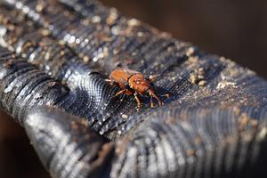 (250403) -- MONTEVIDEO, 3 abril, 2025 (Xinhua) -- Un trabajador sostiene un ejemplar del insecto "picudo rojo de las palmeras" (Rynchophorus ferrugineus) durante las tareas de tala y limpieza de una palmera afectada por el insecto, en Montevideo, capital de Uruguay, el 3 de abril de 2025. Una plaga de Rynchophorus ferrugineus, que afecta a las palmeras por medio de larvas que perforan galerías en el tronco causando su debilitamiento y eventual muerte, se aloja actualmente en la capital uruguaya Montevideo, Canelones, Maldonado, Florida, Flores, San José, Colonia y Lavalleja. (Xinhua/Nicolás Celaya) (nc) (jg) (ah) (vf)