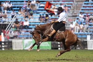 (260330) -- MONTEVIDEO, 30 marzo, 2026 (Xinhua) -- Un gaucho monta un caballo en las jineteadas durante la 99 edición de la Semana Criolla del Prado, en el rodeo de la Rural del Prado, en Montevideo, capital de Uruguay, el 30 de marzo de 2026. (Xinhua/Nicolás Celaya) (nc) (oa) (ah) (vf)