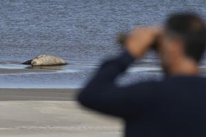 (251021) -- PIRIAPOLIS, 21 octubre, 2025 (Xinhua) -- Un hombre observa a una elefanta marina mientras amamanta a su cría en una playa, en Piriápolis, en el departamento de Maldonado, Uruguay, el 21 de octubre de 2025. (Xinhua/Nicolás Celaya) (nc) (oa) (ah) (ce)