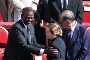 (250427) -- VATICANO, 27 abril, 2025 (Xinhua) -- Imagen del 26 de abril de 2025 del presidente keniano, William Ruto (i), conversando con la primera ministra italiana, Georgia Meloni, en el funeral del papa Francisco en la Plaza de San Pedro, en el Vaticano. El papa Francisco, el 266º pontífice de la Iglesia católica romana murió el lunes a la edad de 88. (Xinhua/Li Jing) (rtg) (ah)