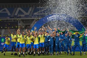 (250217) -- ANZOATEGUI, 17 febrero, 2025 (Xinhua) -- Imagen del 16 de febrero de 2025 de jugadores y cuerpo técnico de Brasil festejando con el trofeo del torneo Sudamericano Sub-20 de la Confederación Sudamericana de Fútbol (Conmebol), al término del partido de la quinta fecha de la fase final, ante Chile, celebrada en el Estadio Olímpico General José Antonio Anzoátegui, en Puerto La Cruz, estado Anzoátegui, Venezuela. (Xinhua/Marcos Salgado) (ms) (oa) (rtg) (ce)