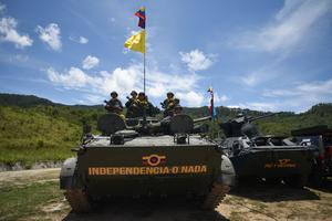 (250913) — CARACAS, 13 septiembre, 2025 (Xinhua) — Integrantes de la Fuerza Armada Nacional Bolivariana (FANB) a bordo de un vehículo blindado participan en una jornada de adiestramiento en el Fuerte Tiuna, en Caracas, Venezuela, el 13 de septiembre de 2025. El presidente de Venezuela y comandante en jefe de la FANB, Nicolás Maduro, convocó el viernes una masiva jornada de adiestramiento en 312 cuarteles y unidades militares en todo el país. (Xinhua/Marcos Salgado) (ms) (oa) (da)