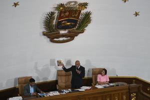 (250701) -- CARACAS, 1 julio, 2025 (Xinhua) -- El presidente de la Asamblea Nacional (AN) de Venezuela, Jorge Rodríguez (c), muestra una fotografía durante una sesión de la AN, en el Palacio Federal Legislativo, en Caracas, Venezuela, el 1 de julio de 2025. El Parlamento venezolano declaró el martes al Alto Comisionado de las Naciones Unidas para los Derechos Humanos, Volker Türk, persona non grata por no pronunciarse contra los migrantes secuestrados y los 18 niños retenidos en Estados Unidos. (Xinhua/Marcos Salgado) (ms) (oa) (ra) (ce)