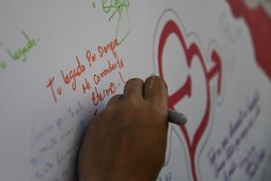 (250305) -- CARACAS, 5 marzo, 2025 (Xinhua) -- Una persona escribe un mensaje en un muro en el mausoleo donde se encuentran los restos del expresidente venezolano Hugo Chávez durante la conmemoración de los 12 años de su fallecimiento, en Caracas, Venezuela, el 5 de marzo de 2025. Militantes del gobernante Partido Socialista Unido de Venezuela se movilizaron el miércoles en calles de la ciudad de Caracas, en conmemoración de los 12 años del fallecimiento del expresidente Hugo Chávez (1999-2013). (Xinhua/Marcos Salgado) (ms) (da) (ra) (ce)