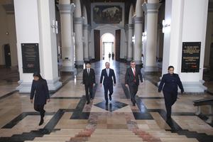 (260429) -- CARACAS, 29 abril, 2026 (Xinhua) -- Imagen del 28 de abril de 2026 del embajador de China en Venezuela, Lan Hu (2-i), el ministro de Relaciones Exteriores de Venezuela, Yván Gil (c), y el embajador de Rusia en Venezuela, Sergey Melik-Bagdasarov (2-d), caminando hacia la tumba de Simón Bolívar durante la ceremonia por el 30 aniversario de la Asociación Estratégica entre China y Rusia, en el Panteón Nacional de Venezuela, en Caracas, Venezuela. (Xinhua/Xu Yongzheng) (jg) (ah) (ce)