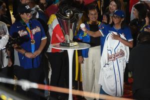 (260319) -- CARACAS, 19 marzo, 2026 (Xinhua) -- Imagen del 18 de marzo de 2026 de la presidenta encargada venezolana, Delcy Rodríguez (d-frente), reaccionando durante un acto para festejar la obtención del primer lugar del Clásico Mundial de Béisbol 2026, en el Palacio de Miraflores, en Caracas, Venezuela. (Xinhua/Marcos Salgado) (ms) (rtg) (ra) (vf)