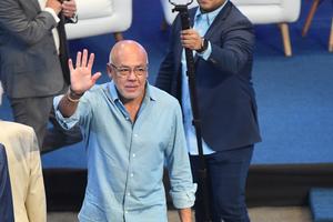 (251014) -- CARACAS, 14 octubre, 2025 (Xinhua) -- El presidente de la Asamblea Nacional de Venezuela, Jorge Rodríguez, saluda previo a un encuentro del Consejo Nacional por la Soberanía y la Paz, en Caracas, Venezuela, el 14 de octubre de 2025. (Xinhua/Marcos Salgado) (ms) (oa) (ah) (vf)