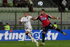 (250424) -- CARACAS, 24 abril, 2025 (Xinhua) -- Imagen del 23 de abril de 2025 del jugador Jesús Yendis (d), de Caracas FC de Venezuela, disputando el balón con Tomás Cuello (d), de Atlético Mineiro de Brasil, durante el partido del grupo H de la jornada 3 de la fase de grupos de la Copa Conmebol Sudamericana celebrado en el Estadio Olímpico de la Universidad Central de Venezuela, en Caracas, Venezuela. (Xinhua/Marcos Salgado) (ms) (da) (ra) (vf)