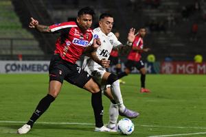 (250424) -- CARACAS, 24 abril, 2025 (Xinhua) -- Imagen del 23 de abril de 2025 del jugador Jeriel De Santis (i), de Caracas FC de Venezuela, disputando el balón con Renzo Saravia (d), de Atlético Mineiro de Brasil, durante el partido del grupo H de la jornada 3 de la fase de grupos de la Copa Conmebol Sudamericana celebrado en el Estadio Olímpico de la Universidad Central de Venezuela, en Caracas, Venezuela. (Xinhua/Marcos Salgado) (ms) (da) (ra) (vf)