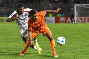 (250307) -- CARACAS, 7 marzo, 2025 (Xinhua) -- Imagen del 6 de marzo de 2025 del jugador José Enrique Caraballo (d), de Deportivo La Guaira de Venezuela, disputando el balón con Edgardo Rito (i), de Caracas FC de Venezuela, durante el partido correspondiente a la primera fase de la Copa Conmebol Sudamericana, celebrado en el Estadio Olímpico de la Universidad Central de Venezuela, en Caracas, Venezuela. (Xinhua/Marcos Salgado) (ms) (rtg) (ra) (vf)