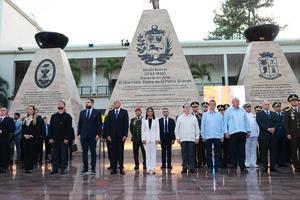 (260109) -- CARACAS, 9 enero, 2026 (Xinhua) -- Imagen proveída por la Embajada de Cuba en Venezuela del 8 de enero de 2026 de la presidenta encargada venezolana, Delcy Rodríguez (c-frente), y el ministro de Relaciones Exteriores cubano, Bruno Rodríguez (5-d-frente), participando en un acto solemne para honrar la memoria y el sacrificio de soldados y ciudadanos fallecidos o heridos el pasado 3 de enero durante el ataque de Estados Unidos, en Caracas, Venezuela. Rodríguez aseguró el jueves que su país no está subyugado a los designios del Gobierno de Estados Unidos tras el ataque militar ocurrido el pasado sábado, mismo que condujo a la captura ilegal del presidente Nicolás Maduro y de su esposa Cilia Flores. (Xinhua/Embajada de Cuba en Venezuela) (ms) (jg) (ra) (vf)