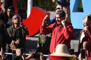 (251012) — CARACAS, 12 octubre, 2025 (Xinhua) — El presidente venezolano, Nicolás Maduro (c), reacciona durante una marcha en el marco del Día de la Resistencia Indígena, en Caracas, Venezuela, el 12 de octubre de 2025. El pueblo venezolano se movilizó el domingo en la ciudad de Caracas, capital del país sudamericano, con motivo del Día de la Resistencia Indígena, como se conoce en Venezuela a la fecha del encuentro entre Europa y América ocurrido el 12 de octubre de 1492. (Xinhua/Marcos Salgado) (ms) (rtg) (ah)
