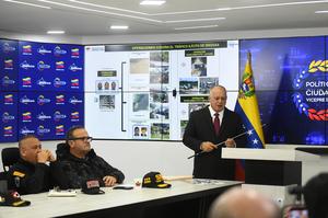 (260113) -- CARACAS, 13 enero, 2026 (Xinhua) -- El ministro para Interior, Justicia y Paz de Venezuela, Diosdado Cabello (c), habla durante una conferencia de prensa, en Caracas, Venezuela, el 13 de enero de 2026. Más de siete toneladas de droga han sido incautadas en Venezuela en lo que va de 2026, informó el martes Diosdado Cabello. (Xinhua/Str) (ms) (oa) (ah) (vf)
